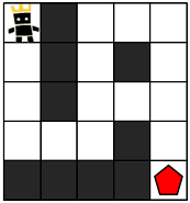 지금부터 당신은 한 팀의 팀원이 되어 게임을 진행하려고 합니다. 다음은 5 x 5 크기의 맵에, 당신의 캐릭터가 (행: 1, 열: 1) 위치에 있고, 상대 팀 진영은 (행: 5, 열: 5) 위치에 있는 경우의 예시입니다.