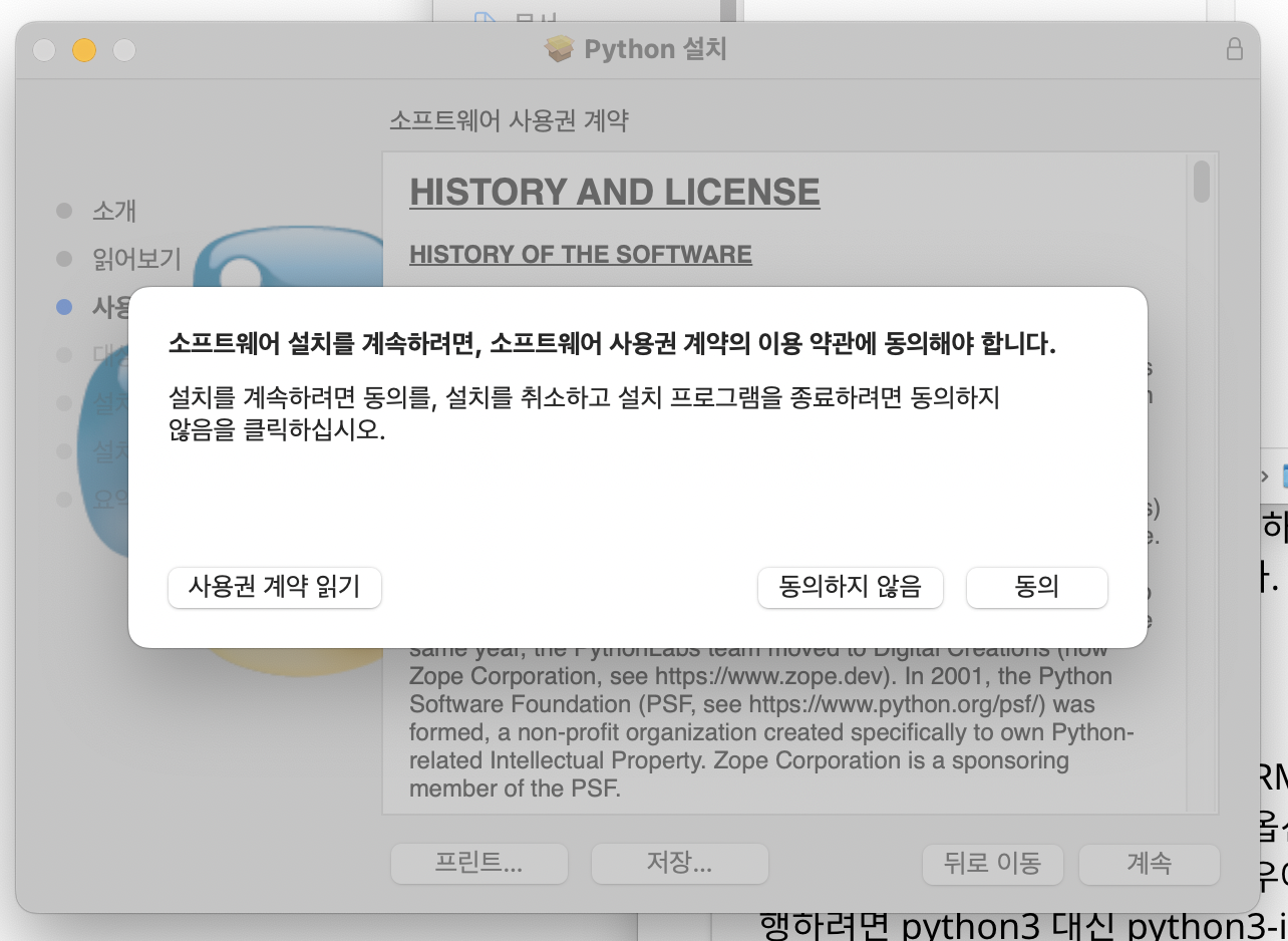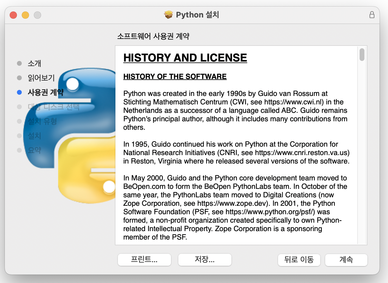 파이썬을 사용하기 위한 라이센스 계약이 나온다.