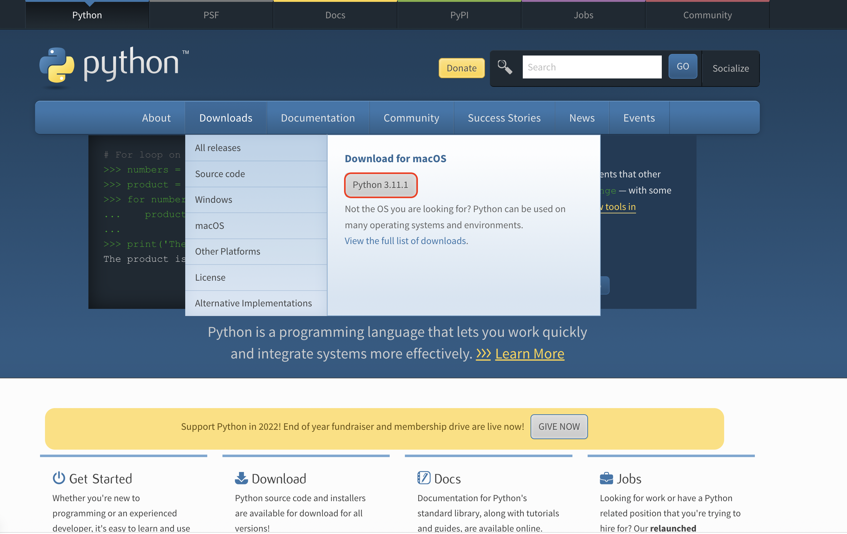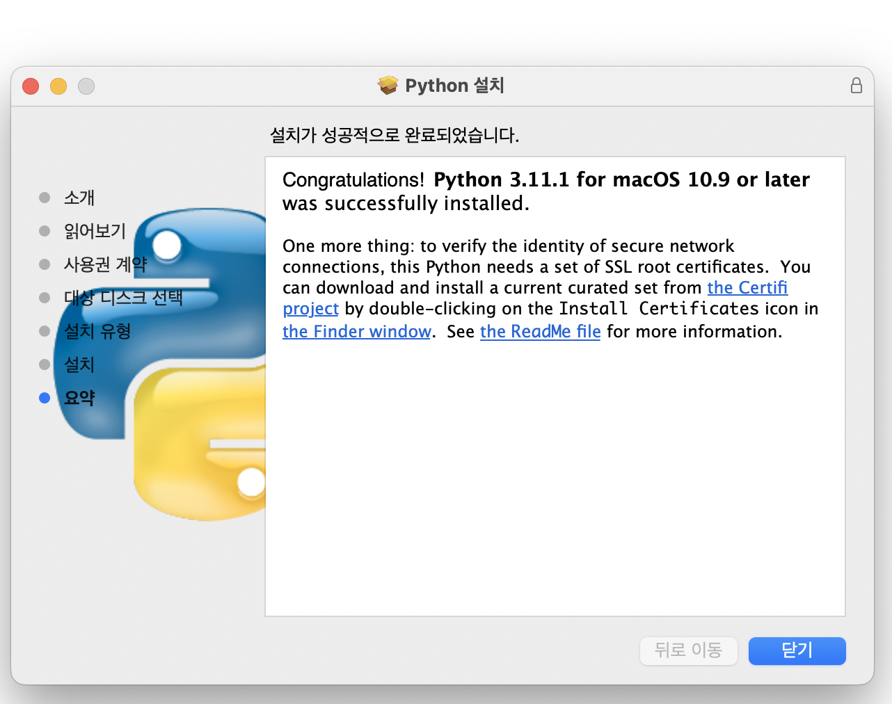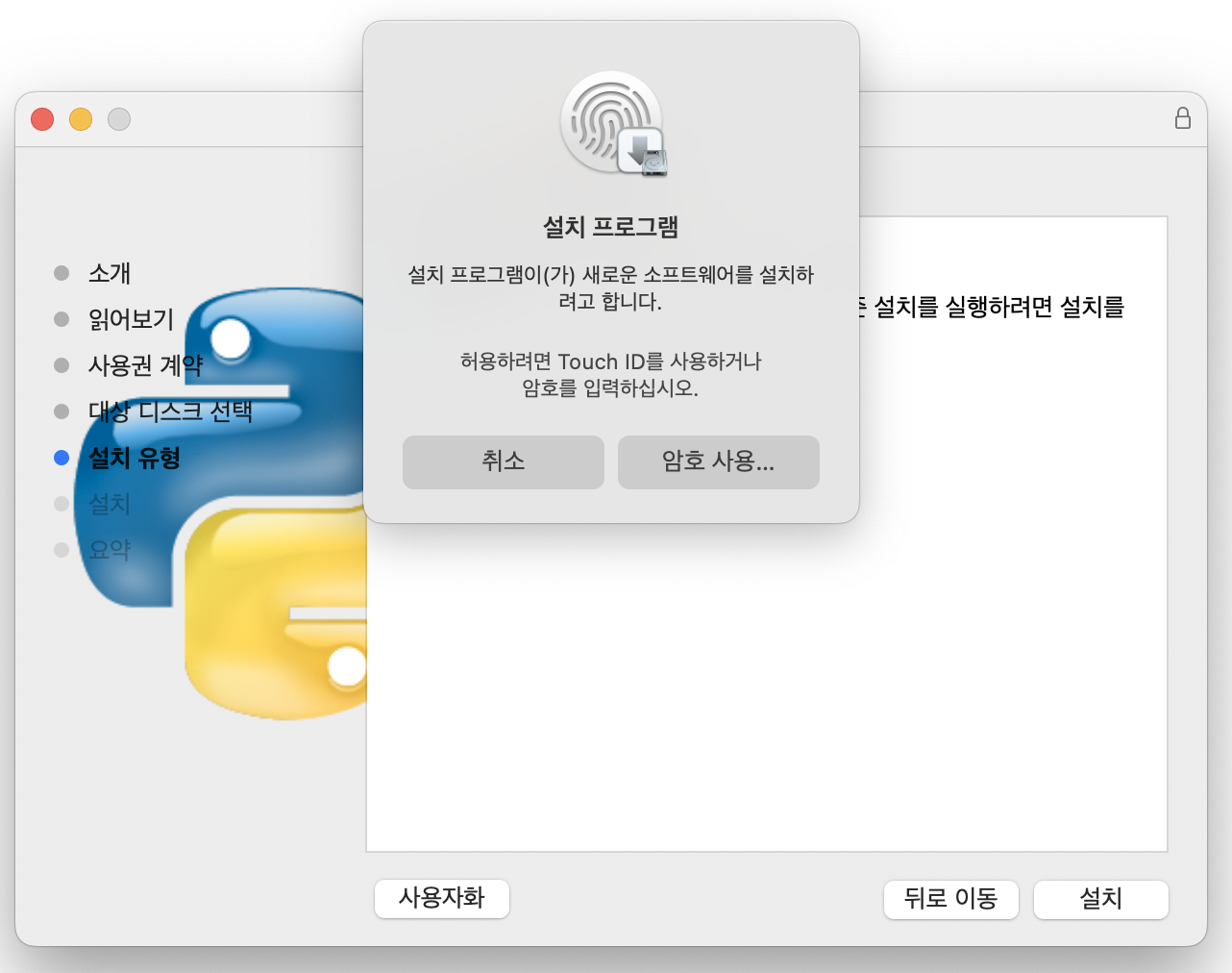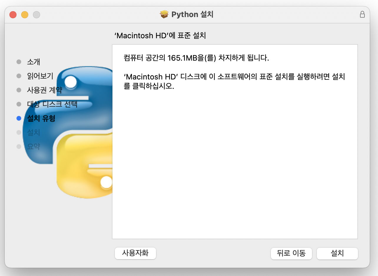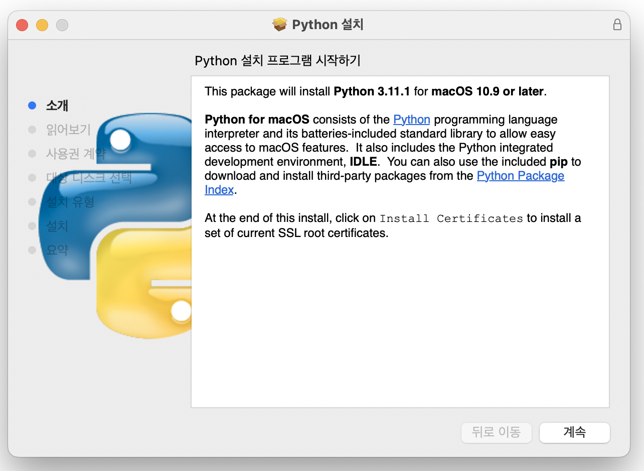 물론 mac전용 패키지 관리용 tool인 brew(https://brew.sh/index_ko)가 설치되어 있다면 명령어 한 줄 이면 설치를 완료할 수 있지만, python은 개발을 전문적으로 하지 않는 사람들도 접하기 쉬운 언어니까 굳이 brew까지 설치하지 않으려는 사람도 있을 것 같아 python만 설치하는 방법을 알아보자.