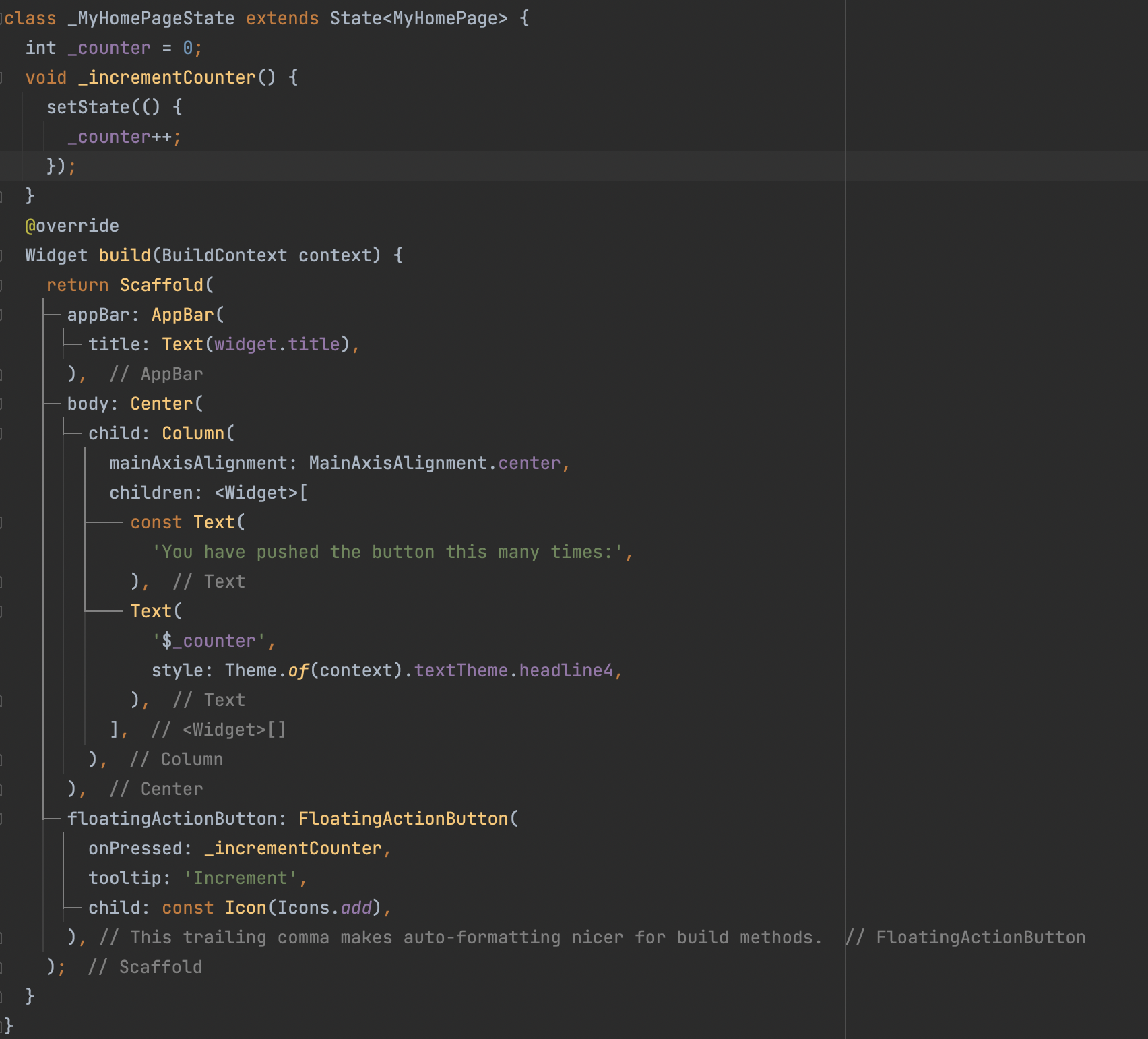우선 Flutter에서 프로젝트를 처음 실행하면 나오는 이 부분에